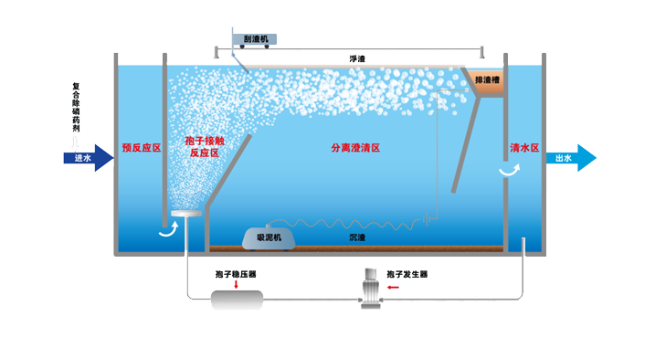 孢子轉(zhuǎn)移技術,是將混凝技術、氣浮技術與微納米孢子相結合,通過定制化藥劑、微納米氣泡與水中的磷、疏水基懸浮物發(fā)生反應,創(chuàng)新形成的一種高效物理化學處理方法。主要解決了目前常用溶氣氣浮技術在應用過程中存在的處理效率較差、表面負荷較低、處理能耗較高、應急機動性不強等問題。